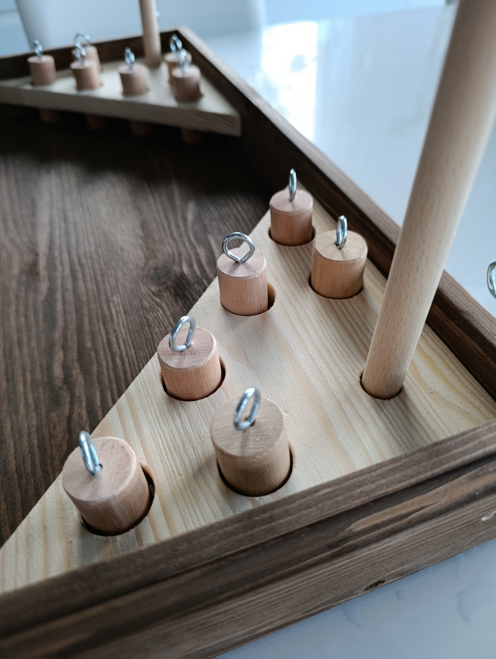 Chaque pièce est façonnée, poncée et assemblée avec soin dans mon atelier, ce qui rend chaque jeu unique. Le contraste entre le bois clair des zones de pêche et le fond teinté met en valeur l’aspect chaleureux et naturel du matériau.
